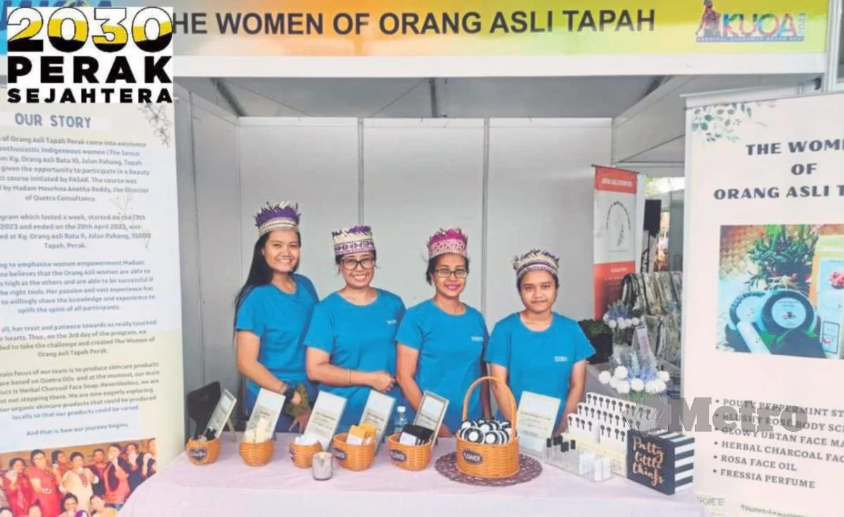 KRISTINA (dua dari kanan) bersama ahli The Women of Orang Asli Tapah membuka reruai produk kecantikan yang dihasilkan mereka sendiri pada Karnival Usahawan Orang Asli 2023 di Sungai Besar, Selangor pada 21 hingga 23 Julai tahun lalu.